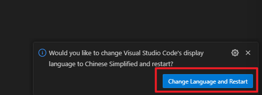 安装完成后,右下角出现提示:是否切换至中文语言并重启,点击此按钮。重启后,VS Code 的语言切换为中文