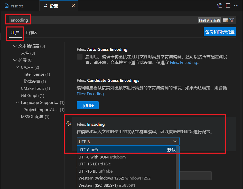 打开设置,保证选择的是 用户,在搜索框中输入 encoding,找到这个设置选项,并设置为 UTF-8