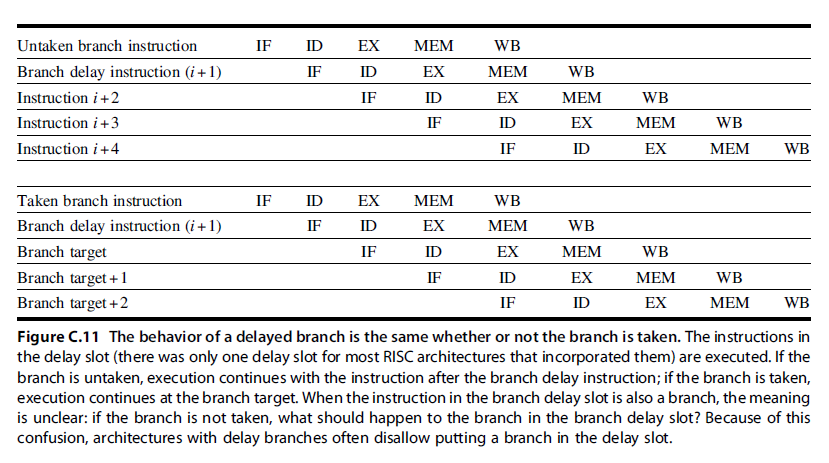 R4000 采取预测不分支的策略,对于未采取的分支,延迟只是一个周期。而对于采取的分支,有一个周期的延迟槽(delay slot),接着是两个空闲周期。延迟槽是指分支指令后的一个指令周期,用于执行一个指令,即使分支被采取