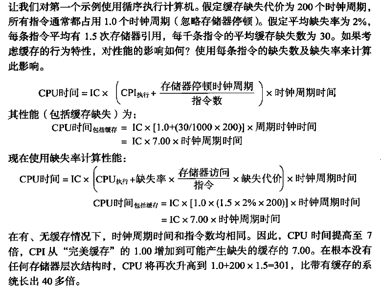 - 在计算 CPI 时,一次缺失的缓存代价是以处理器时钟周期进行计算的。因此,即使两个计算机的存储器层次结构相同,时钟频率较高的处理器在每次缺失时会占用较多的时钟周期,CPI 的存储器部分也相应较高