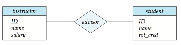 - 线条将 attributes 联系到 entity sets 并且将 entity sets 联系到 relationship sets