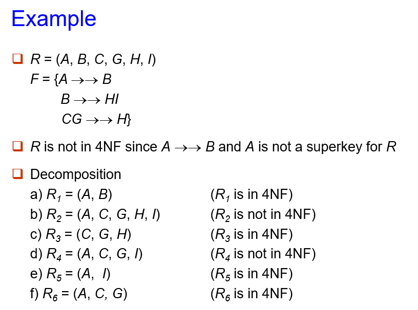 设 \(R_1 = (A,B,C), R_2 = (C,D,E)\)。\(R_1\) 和 \(R_2\) 的公共属性集为 \(C\),C 不是 \(R_1\) 的 super key,也不是 \(R_2\) 的 super key。例如